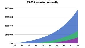 For example, let’s say that your goal is to retire at age 65. At age 20 you begin contributing $3,000 per year to your tax-deferred 401(k) account. If your investment earns 6% per year, compounded annually, you’ll have approximately $679,000